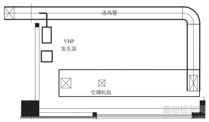 VHP 送風(fēng)管道垂直插入潔凈室空調(diào)送風(fēng)管,出口與氣流方向一致,參見(jiàn)圖2。
