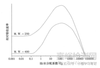 圖1 藥物吸收率與脂溶性、分子量的關(guān)系