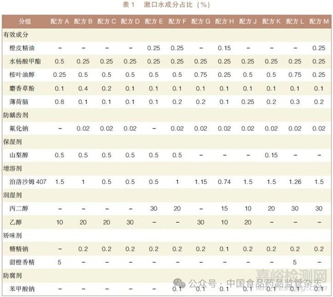 取潤濕劑( 丙二醇或乙醇) 于150ml 燒杯中,分別稱取麝香草酚、薄荷腦于潤濕劑中溶解,再滴加桉葉油醇和水楊酸甲酯,選擇性加入橙皮精油,于燒杯中攪拌均勻,邊攪拌邊緩緩加入純水60ml 以上,溶液變渾濁,再取保濕劑及增溶劑[ 泊洛沙姆407 或( 和) 山梨醇],分批加入,直至溶液變澄清,再選擇性加入防齲齒劑氟化鈉,并加入矯味劑糖精鈉或(和) 甜橙香精,選擇性加入防腐劑苯甲酸鈉至燒杯中溶解,加水定容至100ml,即得。具體配方設計詳見表1 ( 表中列出了除水之外的其他物質(zhì)的用量)。