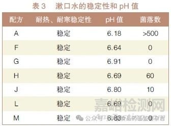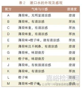 漱口水的外觀性狀基本要求:在外觀方面,漱口水應為澄清透明的液體,無懸浮物、沉淀物和雜質(zhì);在氣味方面,漱口水應具有清新、自然的香氣,無異味;在口感方面,漱口水應口感清爽,無刺激感,不含有任何苦味、澀味或異味。對漱口水的氣味、口感及澄清度等外觀性狀的觀測,詳見表2。由此可知,配方A、配方F~J 及配方L~M 均符合要求。
