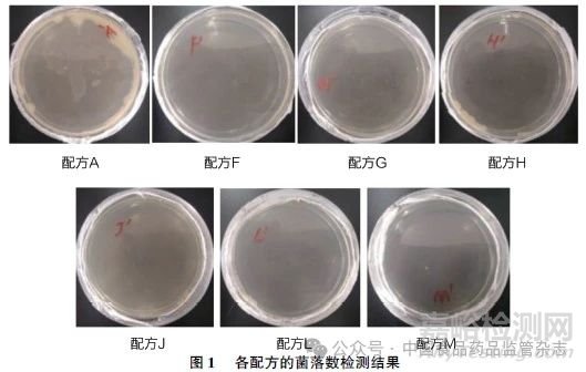 漱口水要求在耐熱穩(wěn)定性測試中無凝聚物且不混濁,在耐寒穩(wěn)定性測試中不凍結且色澤穩(wěn)定,據(jù)此篩選出在耐熱耐寒穩(wěn)定性測試中均不渾濁的漱口水配方A、F、G、H、J、L、M 進行pH 及抑菌效果的檢測,詳見表3 (漱口水的pH 應處于3.0 ~10.5之間)。待測漱口水樣品于37℃恒溫培養(yǎng)48h 后,取出目測并計算菌落數(shù),每毫升菌落總數(shù)≤500 個為合格,見圖1。由此可知,配方F、G、H、J、L、M均符合要求。綜合口感后,選定配方F、L、M 進行下一步研究。