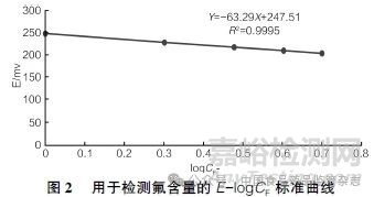 精密吸取氟離子標準溶液0.5ml、1.0ml、1.5ml、2.0ml、2.5ml,分別加入盛有5ml枸櫞酸鹽緩沖液的50ml 容量瓶中,另取5ml 枸櫞酸鹽緩沖液加入50ml 容量瓶中作為空白對照,6份溶液均用超純水稀釋至刻度,搖勻后倒入燒杯中,測量電位值E,作E-logc (c 為濃度) 標準曲線方程。
