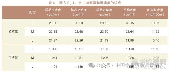 建立了氟含量測定的標準曲線,Y= -63.29X +247.51, R2=0.9995,其符合方法學要求,見圖2。漱口水中氟離子含量宜≤25mg/100ml。通過檢測,發(fā)現(xiàn)配方F、L、M 中氟含量均小于25mg / 100ml, 均符合要求。為保證總含氟量不超標,優(yōu)選配方F、L進行下一步研究, 詳見表4。