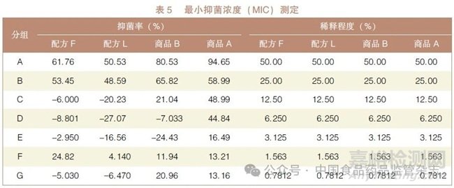 配制各漱口水的起始濃度都為184μg / ml,逐級稀釋, 當其抑菌率大于50%時即為MIC[17] 。自制漱口水1 (配方F) 的MIC 為46μg/ml,自制漱口水2(配方L) 的MIC 為92μg/ml,而兩種進口品牌的漱口水MIC 都是46μg/ml,詳見表5。結果表明,兩種自制漱口水均具有一定的抑菌能力,且配方F的抑菌能力略強于配方L?;诠πХ矫婵紤],最終選定配方F 作為最優(yōu)配方,詳見表6。