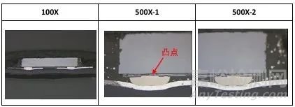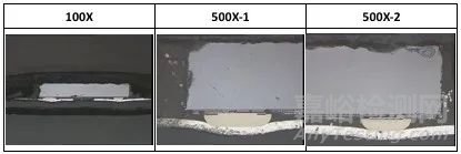 從金相圖片中可以看出,黑色不良品和紅色良品由于批次不一樣,內(nèi)部構(gòu)造存在差異。不良品單純通過(guò)ACF膠導(dǎo)電粒子連通的方式,而良品則通過(guò)芯片兩側(cè)凸點(diǎn)壓迫導(dǎo)電粒子,增大連接面積的方式進(jìn)行連通。由于內(nèi)部構(gòu)造不同,良品的有效接觸區(qū)域大于不良品;此外,良品導(dǎo)電粒子的受力明顯高于不良品。