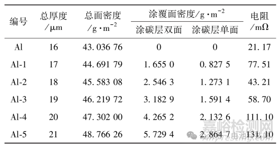 正極片集流體為 16 μm 厚的光鋁箔和 5 種雙面涂碳(涂碳層導(dǎo)電劑為 SP+ks-6 體系)鋁箔。編號 Al-1、Al-2、Al-3、Al-4 和 Al-5 的涂碳鋁箔,涂碳層總厚度分別為 1. 0 μm、2. 0 μm、3. 0 μm、4. 0 μm和 5. 0 μm。