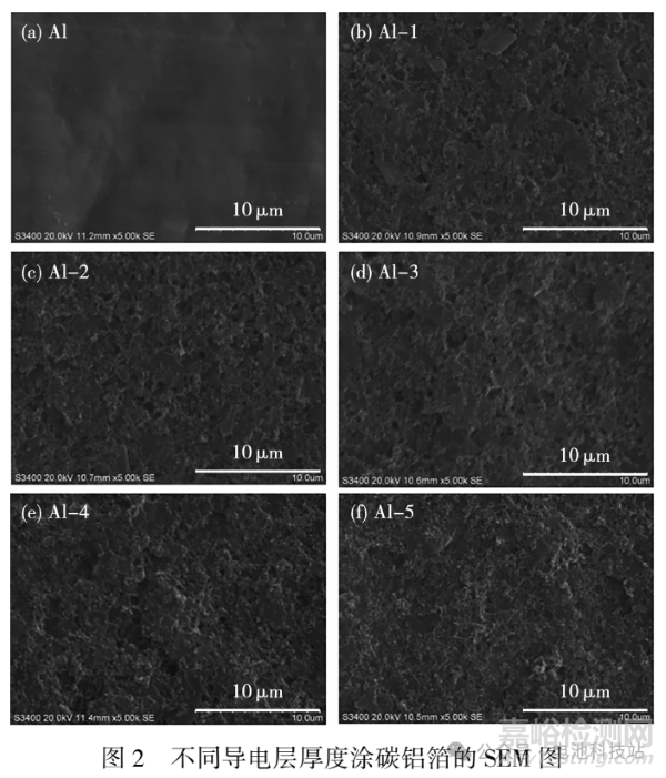 從圖 2 可知,涂碳后的基材表面整體呈疏松多孔狀,相對于光鋁箔而言,表面變得更粗糙,有更多的顆粒接觸點位。表面形貌的上下起伏隨著導(dǎo)電涂層厚度的增加而變得嚴重,但即使是 Al-1 鋁箔,碳層也能均勻地涂覆在光鋁箔上。此導(dǎo)電涂層由約 3. 4 μm 的顆粒及更小的 150~ 200 nm 的顆粒組成,導(dǎo)電涂層漿料的顆粒還有部分團聚。