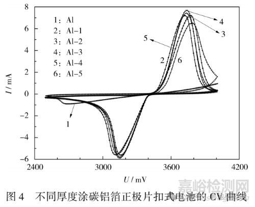 從圖4可知,不同厚度的涂碳鋁箔扣式電池都有對稱的氧化還原峰,氧化還原反應(yīng)可逆性比光鋁箔更好,氧化峰與還原峰之間的距離比光鋁箔的小,說明涂碳層的存在減輕了極片的極化。