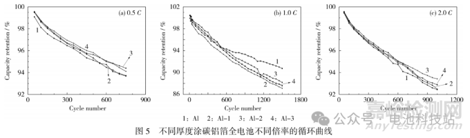 為進一步探究何種厚度的涂碳層集流體能將性能發(fā)揮最優(yōu),將 Al、Al-1、Al-2、Al-3 的正極片與負極片組裝成全電池進行分析。