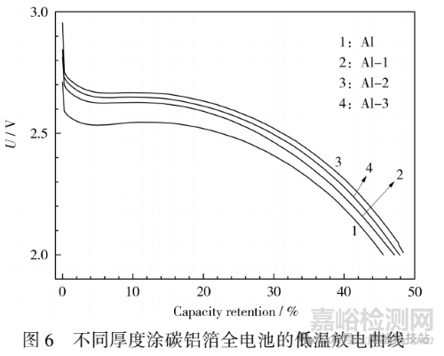 除循環(huán)性能,還研究了全電池的低溫性能,結(jié)果見圖 6。從圖 6 可知,Al-2 的低溫性能更好,電壓平臺更高,極化更輕。對于 Al 來說,放電平臺電壓較 Al-1 低 0.1V,比 Al-2低 0. 3 V;放電比容量也偏低,Al 放出初始電量的 45. 16%,Al-2 放出初始電量的 48. 39%。其余涂碳箔材的低溫放電性能也比光鋁箔的好。
