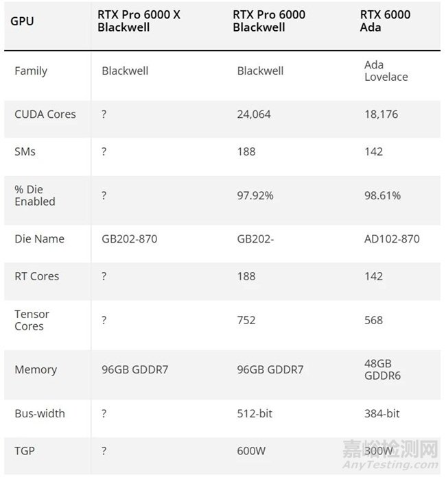 據(jù)報(bào)道,非 X 版本具有 188 個(gè) SM,相當(dāng)于 24,064 個(gè) CUDA 核心或啟用率 97.9% 的 GB202 芯片。LeadTek 的數(shù)據(jù)提到了 600W TGP,是 RTX 6000 Ada 要求的兩倍多,但足以通過(guò)一條12V-2x6電源線滿足要求。NBD 的進(jìn)一步細(xì)節(jié)描繪了我們認(rèn)為是用于工作站的 Blackwell GB20X 芯片。主打 RTX Pro 6000 X Blackwell 似乎搭載了 GB202-870 芯片,預(yù)計(jì)將配備所有 192 個(gè) SM。
