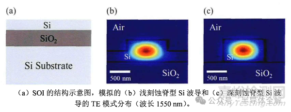 圖中(b)和(c)分別為淺刻蝕和深刻蝕的Si波導(dǎo)的TE模式分布圖(波長1550nm)? 波長為1550nm時, Si的折射率為3.48, SiO2的折射率為1.46, Si和SiO2之間存在大的折射率差, 使得Si 波導(dǎo)對光具有很強的限制能力,波導(dǎo)中光模式尺寸小和彎曲損耗低, 大大減小了器件的體積和提高了光子器件在SOI 上的集成密度?