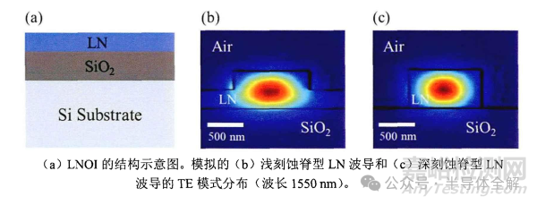 下圖顯示了LNOI的結(jié)構(gòu)示意圖,以及淺刻蝕和深刻蝕的LN波導(dǎo)的 TE 模式分布圖(波長1550nm)?