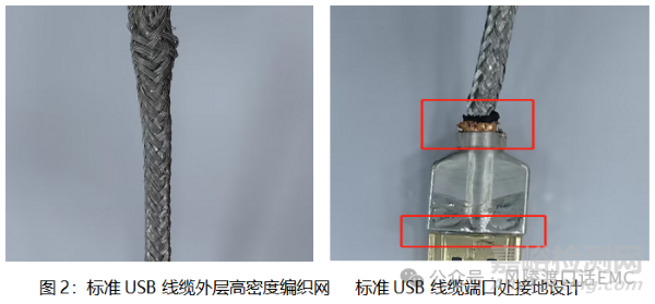 對(duì)于非標(biāo)準(zhǔn)USB線纜來(lái)說(shuō),USB差分信號(hào)采用雙絞線設(shè)計(jì),采用高編織密度金屬網(wǎng)或者使用導(dǎo)電膠布進(jìn)行屏蔽,屏蔽層的接地應(yīng)采用平面接地的方式,避免使用單獨(dú)地線接地的設(shè)計(jì)方式,以達(dá)到降低接地寄生電感的目的,改善接地阻抗引起的共模噪聲電流。