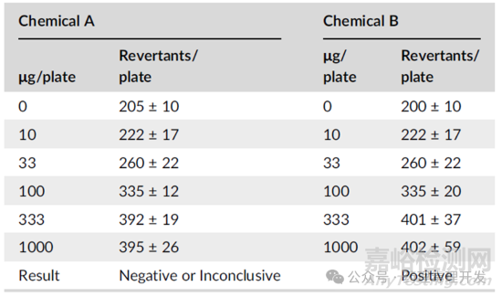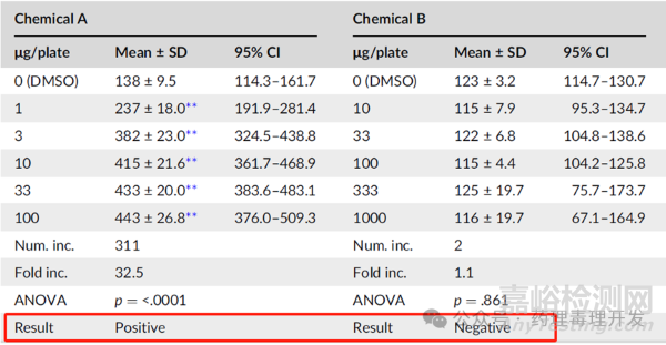 另外,這種嚴(yán)格的倍數(shù)規(guī)則,屬于劃一條線,過線即陽性,忽視了皿與皿之間的差異。可能會出現(xiàn)下表之中的情況,不同皿之間的溶媒對照計數(shù)略有差異,按照嚴(yán)格2倍規(guī)則計算,就會對結(jié)論造成影響?;衔顱如果溶媒對照與化合物A一致,則致突變結(jié)果可能就是陰性或不確定。