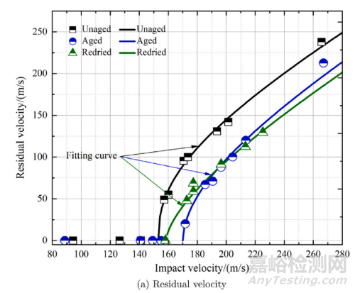 圖3 不同濕熱狀態(tài)下試驗(yàn)結(jié)果:a)彈道極限; b)能量吸收率