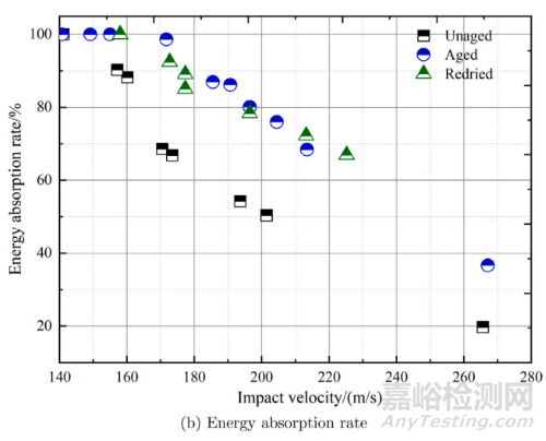 對(duì)于濕熱老化后的復(fù)合材料板,其在高速?zèng)_擊破壞過程中,裂紋脫粘做的功提升: