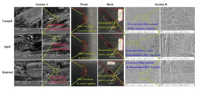 為了從微觀失效機(jī)制方面探討濕熱老化對(duì)復(fù)合材料彈道性能改善的機(jī)制,結(jié)合SEM分析了復(fù)合材料板的微觀損傷形貌(如圖4所示),結(jié)果發(fā)現(xiàn)未老化靶板沖擊區(qū)域纖維斷口比較齊整,而濕熱老化和重復(fù)干燥靶板沖擊區(qū)域纖維斷口長(zhǎng)短不一,可能的原因是濕熱老化削弱了纖維/樹脂界面,導(dǎo)致纖維之間應(yīng)力傳遞不連續(xù),出現(xiàn)一些纖維拔出和脫粘,這些現(xiàn)象反而會(huì)提升CFRP纖維方向的斷裂韌性,如圖5所示。