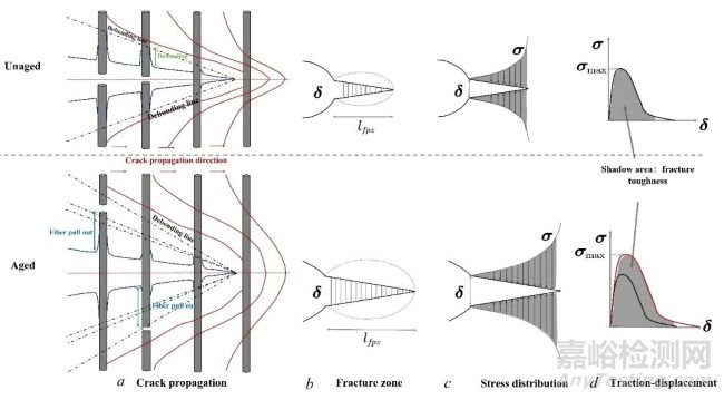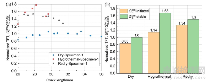 故而,濕熱老化后復(fù)合材料板纖維向斷裂韌性(Translaminar fracture toughness)也得到改善: