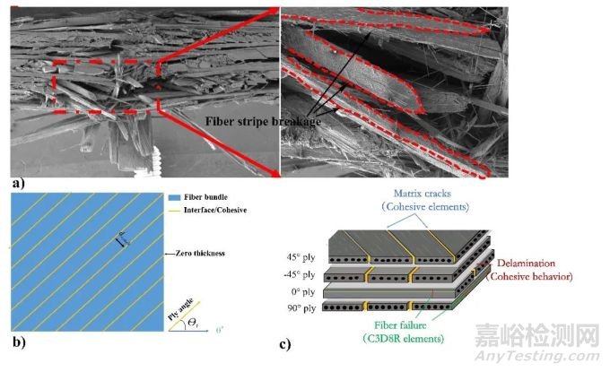 圖6 (a) CFRP沖擊區(qū)的典型損傷形貌;(b) HFEDCM模型示;(c)沖擊損傷模型及相關(guān)單元類型