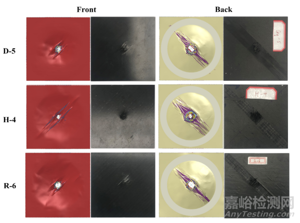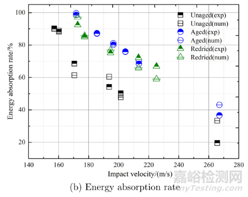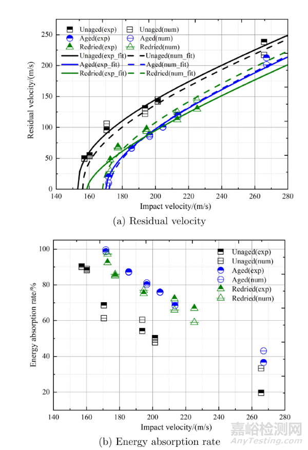 圖8和圖9基于殘余速度和能量吸收率對(duì)HFEDCM模型在高速?zèng)_擊下的預(yù)測(cè)能力進(jìn)行了評(píng)估。數(shù)值結(jié)果(不僅包括彈道極限,還包括宏觀損傷形貌)與所有濕熱條件下碳纖維增強(qiáng)復(fù)合材料(CFRP)高速?zèng)_擊試驗(yàn)的結(jié)果高度吻合。