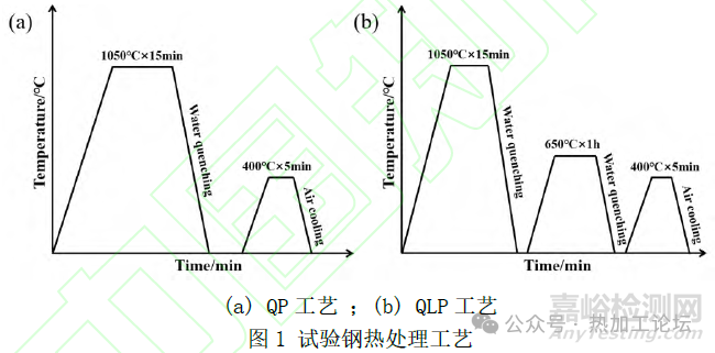 對軋制后的高氮超級馬氏體不銹鋼試料進行QP 和QLP 熱處理,試驗鋼熱處理工藝如圖1所示。QP 工藝如圖1(a)所示,將試樣升溫至1050℃保溫15min后快速水冷,然后在400℃配分5min后空冷至室溫;QLP工藝如圖1(b)所示,試樣先在1050℃奧氏體化15min后快速水冷,隨后在650℃保溫1h 后水冷,最后在400℃配分5min后空冷至室溫。