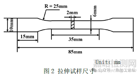 室溫拉伸性能測試采用LD26電子萬能試驗機,應變速率為10-3/s。試樣尺寸如圖2所示,其中,R為圓角半徑,使用GB/T228.1-2021標準沿板材縱向加工而成。為保證試驗數(shù)據(jù)的可靠性,每組取3個平行試樣。