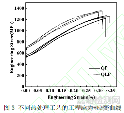 觀察2組樣品的拉伸曲線特征,斷裂前均未發(fā)生明顯頸縮,QP試驗鋼的屈服強度和抗拉強度分別為547MPa和1246MPa,伸長率為33.70%;QLP試驗鋼的屈服強度、抗拉強度、伸長率分別為713MPa、1344MPa和31.03%。對比發(fā)現(xiàn),經(jīng)過雙相區(qū)淬火的試驗鋼強度有所提升,尤其是屈服強度,提升了166MPa,而塑性沒有明顯降低。