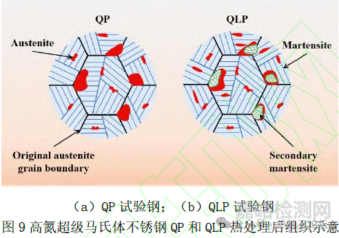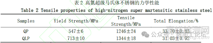 綜上所述,本文以氮合金化后的超級馬氏體不銹鋼為研究對象,對其分別進行QP和QLP熱處理工藝,隨后進行室溫拉伸性能測試。并采用X 射線衍射儀(XRD)、掃描電子顯微鏡(SEM)、透射電子顯微鏡(TEM)等表征其微觀組織,研究2組熱處理工藝對高氮超級馬氏體不銹鋼組織性能的影響。