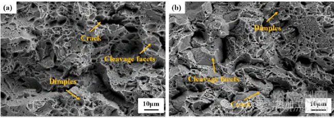 不同熱處理工藝下拉伸試樣的斷口形貌如圖4所示。2組試驗鋼的斷口形貌均由韌窩、解理面和裂紋組成,解理面周圍分布著大小不一的韌窩,表現(xiàn)為典型的混合斷裂。裂紋一般傾向于沿馬氏體板條邊界擴展,當材料承受較大的拉伸應力時,局部應力會遠超材料的屈服強度,促使材料內部晶體以解理方式斷裂,形成解理面。QP試驗鋼的斷口形貌如圖4(a)所示,韌窩尺寸較大,但數(shù)量較少;QLP試驗鋼的斷口形貌如圖4(b)所示,該樣品存在大量小而致密的韌窩,這些韌窩可能是在變形馬氏體和馬氏體基體的界面產(chǎn)生的。