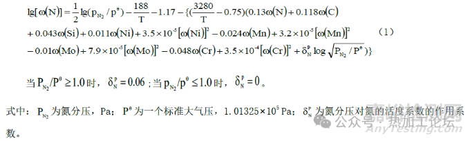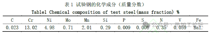 本試驗使用的高氮超級馬氏體不銹鋼委托東北大學冶金學院制備,根據(jù)目標鋼種成分及冶煉溫度,利用氮溶解度模型[式(1)]獲得冶煉壓力和澆鑄壓力,使用其研發(fā)的加壓感應爐分階段控制壓力,精確控制超級馬氏體不銹鋼中氮含量,化學成分見表1。坯料先隨爐升溫至1150℃保溫1 h,鍛造成厚度為30mm的鍛板,隨后在1200℃均勻化處理1h,進一步進行熱軋加工,得到厚度為12mm的熱軋板。