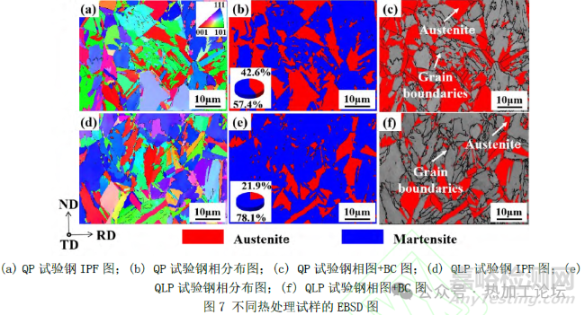 不同熱處理工藝試樣的EBSD 圖如圖7 所示。由圖7(a)、(b) 、(d)和 (e) 可知,2組試驗鋼都具有奧氏體相和馬氏體相,其中奧氏體相有尺寸較大的塊狀和細小的薄膜狀2種形態(tài)。由圖7(c)、(f)可知,塊狀奧氏體主要沿原奧氏體晶界分布在馬氏體胞上,薄膜狀奧氏體主要分布于馬氏體板條邊界。這是因為在配分過程中,元素發(fā)生了擴散并富集在馬氏體和奧氏體邊界,有利于奧氏體形核,從而在邊界處形成了這部分細小的薄膜狀奧氏體。對比2 組不同熱處理工藝試驗鋼的EBSD 圖片可以看出,QP 試驗鋼中奧氏體體積分數(shù)為42.6%,薄膜狀奧氏體的體積分數(shù)為3.6%,增加了雙相區(qū)淬火工藝后,奧氏體總的體積分數(shù)降低至21.9%,但薄膜狀奧氏體的體積分數(shù)增加為6.0%,塊狀奧氏體尺寸明顯減小。奧氏體的穩(wěn)定性與尺寸成反比,這些細小的薄膜狀奧氏體元素更富集,穩(wěn)定性更高。