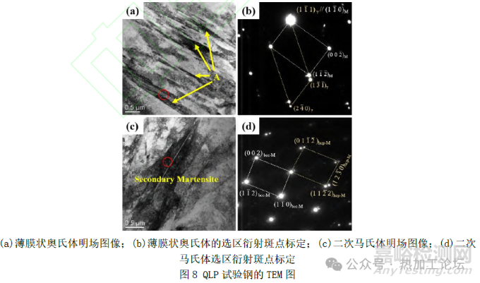 QLP試驗鋼的TEM圖如圖8所示。由圖8(a)可以明顯觀察到薄膜狀奧氏體,圖8(b)顯示了相應的選區(qū)衍射斑點圖,可以看出薄膜狀奧氏體與馬氏體基體呈圖片取向關系,即KS取向關系。當裂紋擴展到這部分奧氏體時,奧氏體會發(fā)生馬氏體相變,吸收大量的變形能,使裂紋的尖端變鈍,阻礙裂紋的進一步擴展,對材料塑性的提高有利。由圖8(c)中可以觀察到二次馬氏體的存在,這是雙相區(qū)淬火過程中,部分一次淬火形成的塊狀奧氏體發(fā)生馬氏體轉變形成的。二次馬氏體形成時會伴隨大量位錯的產(chǎn)生,這些新增的位錯與材料中原有的位錯產(chǎn)生相互作用,進而提高了屈服強度。圖8(d)為二次馬氏體選區(qū)衍射斑點標定,同時觀察到了bcc 和hcp 結構的二次馬氏體,這些hcp 結構的馬氏體可能是由于相變應力形成的。