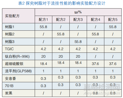 探究樹(shù)脂對(duì)于流掛性能的影響的實(shí)驗(yàn)配方設(shè)計(jì)見(jiàn)表2。