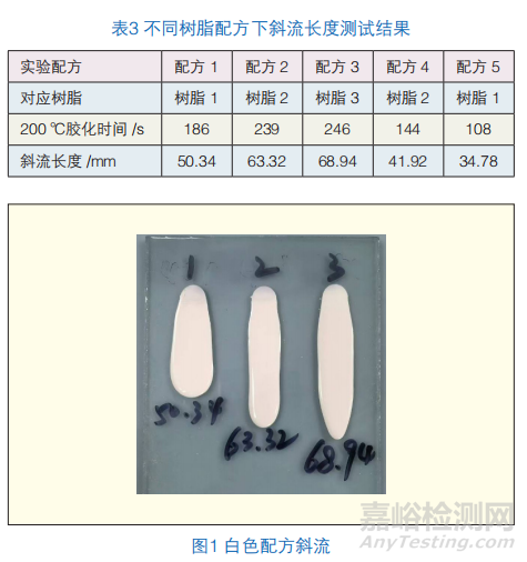 不同樹(shù)脂配方下斜流長(zhǎng)度測(cè)試結(jié)果見(jiàn)表3、圖1和圖2。