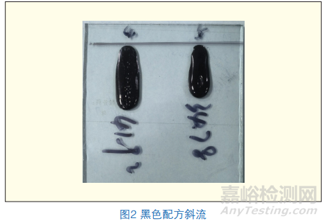 另外對(duì)比配方1和配方5,以及配方2和配方4的斜流數(shù)據(jù)可以看到,當(dāng)樹(shù)脂保持一致時(shí),黑色配方的斜流比白色配方的斜流短的多,說(shuō)明除了樹(shù)脂影響粉末涂料的斜流外,顏料對(duì)于斜流也有影響,主要是因?yàn)樘亢诘奈土勘肉伆追鄞蟮亩啵谏浞降姆勰┩苛象w系黏度比白色大的多,導(dǎo)致斜流偏短。
