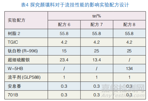 探究顏填料對(duì)于流掛性能的影響的實(shí)驗(yàn)配方設(shè)計(jì)見(jiàn)表4。