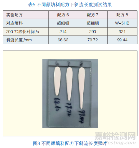 不同顏填料配方下斜流長(zhǎng)度測(cè)試結(jié)果見(jiàn)表5和圖3。
