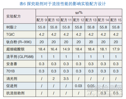 探究助劑對(duì)于流掛性能的影響的實(shí)驗(yàn)配方設(shè)計(jì)見(jiàn)表6。