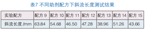 不同助劑配方下斜流長(zhǎng)度測(cè)試結(jié)果見(jiàn)表7。