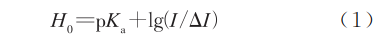 采用超聲波振蕩溶解,配制 0.01 mmol·L−1指示劑溶液,將離子液體與上述指示劑溶液混合,配制成16.82mmol·L−1離子液體溶液,采用紫外-可見分光光度計(jì)進(jìn)行全波長掃描,掃描范圍200~800nm,得到紫外光譜圖,將指示劑的酸解離常數(shù)(pKa)、最大吸光度(I)、空白溶液(不含離子液體)最大吸光度(I0)與I的差值(ΔI)帶入公式(1)計(jì)算H0值。