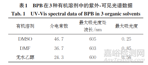 有機(jī)溶劑的介電常數(shù)和其極性正相關(guān),由表1可知:3種溶劑極性由強(qiáng)到弱依次為 DMSO、DMF、無水乙醇;DMSO最大吸光度處波長(605nm)大于其他有機(jī)溶劑的,最大吸光度小于其他有機(jī)溶液的。這是由于極性較大的溶劑分子偶極增大了溶質(zhì)分子的極性,導(dǎo)致了吸收峰紅移;BPB為中極性分子,極性溶劑 DMSO對BPB的溶解度較小。
