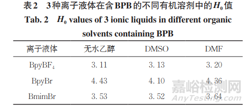 以BPB作為指示劑可以獲取 BpyBF4、BpyBr、BmimBr離子液體的H0值,因此試驗(yàn)比較了以BPB作 為指示劑時(shí)不同有機(jī)溶劑下BpyBF4、BpyBr、BmimBr離子液體 H0值的變化,結(jié)果見表2。