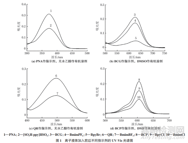 以16.82mmol·L−1離子液體溶液為待測對象,試驗(yàn)進(jìn)一步考察了其他離子液體適用的指示劑和有機(jī)溶劑。結(jié)果顯示:PNA是單色指示劑,其pKa值為0.99,在無水乙醇中的最大吸收出現(xiàn)在373nm處,適用于 [SO3H-ppy]HSO4酸強(qiáng)度的檢測,[SO3H-ppy]HSO4加入前后的UV-Vis光譜圖如圖1(a)所示。BCG是磺代酚酞類指示劑,其顏色和吸收峰出現(xiàn)位置都與BPB的接近,其pKa值為4.66,在DMSO中的最大吸收位于 625nm處,以其作指示劑可獲得強(qiáng)極性BmimPF6和BpyBr 的H0值,加入BmimPF6和BpyBr前后的UV-Vis光譜圖如圖 1(b)所示。QR是單色指示劑,其pKa值為2.70,在無水乙醇中的最大吸收位于497nm處,沒有其他吸收峰的干擾,以其作指示劑可以獲取BmimBF4的H0值,UV-Vis光譜圖如圖(1c)所示。BCP也屬于磺代酚酞類指示劑,其顏色變化和吸收峰位置都與BPB的接近,其pKa為6.12,微溶于無水乙醇,可溶于DMF,最大吸收位于605nm處,以BCP作為指示劑,DMF作為有機(jī)溶劑,獲取的BmimCl和BpyCl的UV-Vis光譜圖如圖1(d)所示。其他指示劑,如甲基黃屬于偶氮類化合物,在酸、堿環(huán)境下分別顯示黃色和紅色,最大吸收波長分別為405,515nm,吸收峰存在明顯重疊,對UV-Vis檢測結(jié)果干擾很大;偶氮類化合物的甲基紅以及磺代酚酞類指示劑百里酚藍(lán)吸收峰位置和顏色變化與甲基黃的類似;甲基紫是對氨基苯甲酸衍生物的混合物,吸收峰很復(fù)雜,也不適合用作離子液體的指示劑。