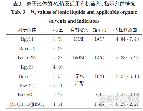 結(jié)合上述研究結(jié)果,在適用的指示劑溶液中加入離子液體,配制成16.82mmol·L−1離子液體溶液,按照公式(1)計(jì)算H0值,結(jié)果見表3。為避免較大誤差,以試劑空白的5%和95%計(jì)算H0檢測范圍,最優(yōu)試驗(yàn)結(jié)果見表3。