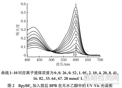 以BpyBF4為例,考察了以BPB作指示劑,無水乙醇作有機(jī)溶劑時(shí),本方法定量檢測離子液體酸強(qiáng)度的適用性。用無水乙醇配制0.01mmol·L−1 BPB 溶液,加入不同量BpyBF4,配制成不同BpyBF4濃度的離子液體溶液,所得的UV-Vis光譜圖如圖2所示。
