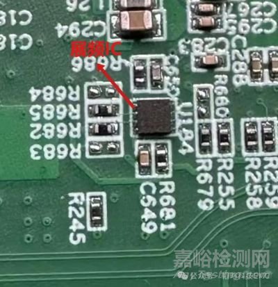 最后在HDMI輸出芯片的晶振處加入我司的展頻IC,對HDMI的時鐘進行展頻處理,展頻IC放到板上的實物圖如下,芯片和晶振在PCB板的另外一面。
