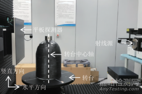 選用微米級焦點(diǎn)CT(焦點(diǎn)尺寸為4 μm,型號nanoVoxel-4000,天津三英精密儀器股份有限公司生產(chǎn))。配備的X射線源管電壓為20~225 kV,像素為3072×3072、配備像素間距為140 μm和有效成像視野為430 mm×430 mm的大視場平板探測器,以保證射線能穿透儲氫氣瓶,并投影至平板探測器。工業(yè)CT掃描儲氫氣瓶現(xiàn)場如圖2所示。