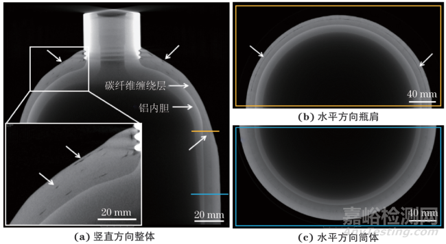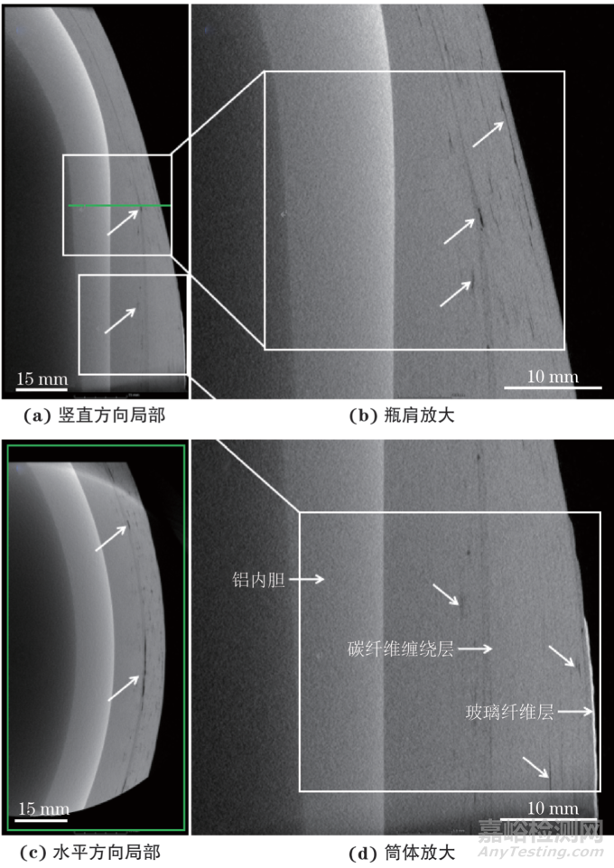 儲氫氣瓶整體掃描的工業(yè)CT圖像(體素尺寸101 μm)如圖3所示,圖中箭頭指出了分層缺陷的位置。