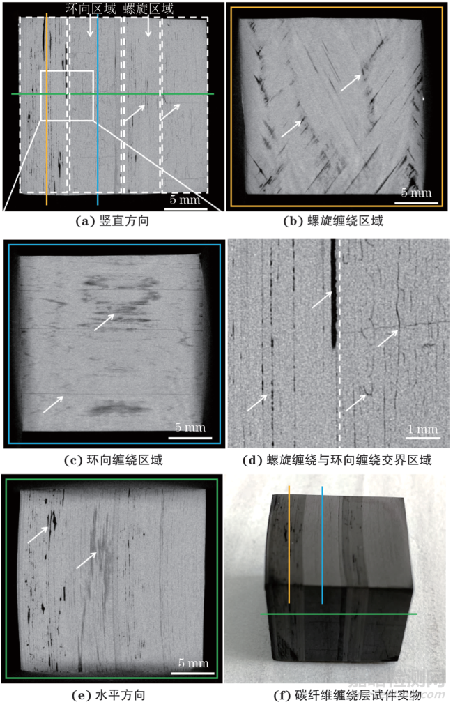 此類缺陷使用儲氫氣瓶工業(yè)CT局部掃描以及碳纖維纏繞層試件的整體掃描均可檢出,CT圖像體素尺寸分別為37 μm 和12 μm。